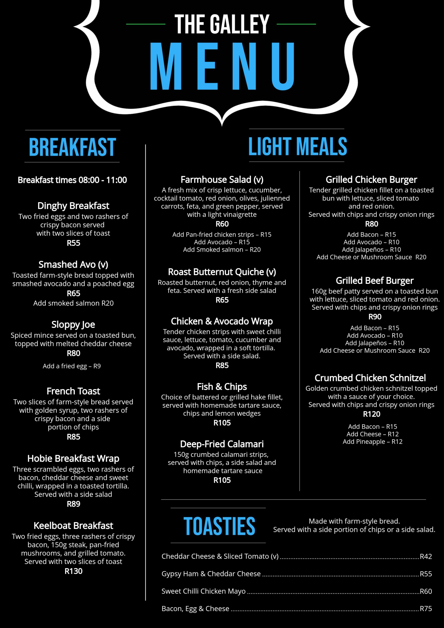 Situated at the Club house, the Galley Restaurant is open to all, serving a variety of meals; breakfast, lunch and suppers.